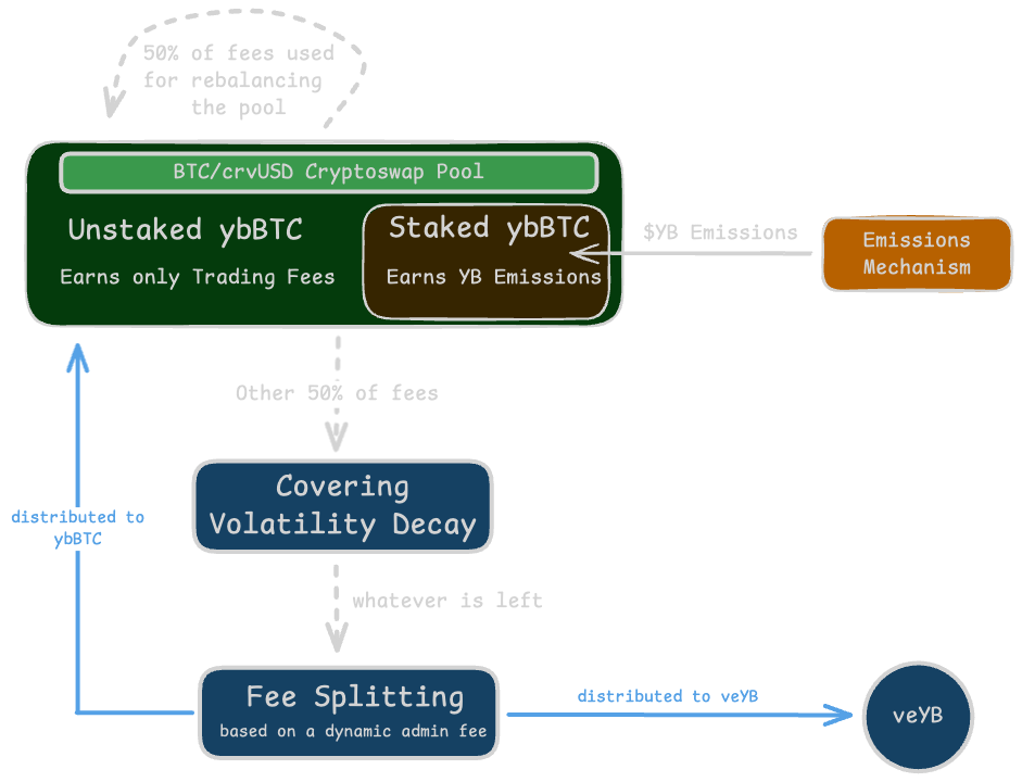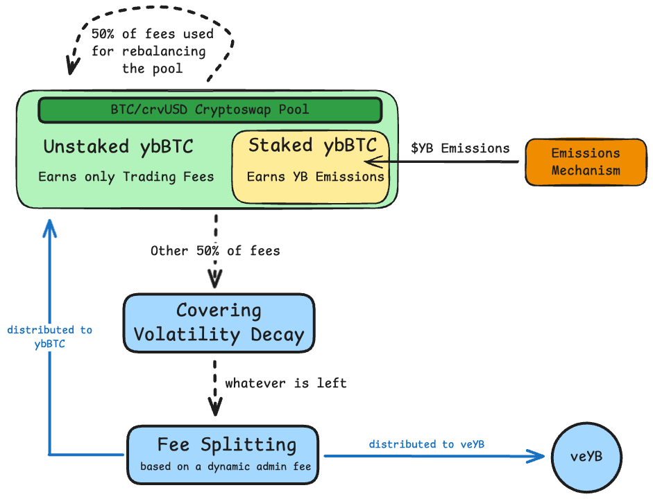 - Net Distributable Amount: Whatever remains after covering volatility decay is split between unstaked ybBTC holders and veYB holders according to the dynamic admin fee.